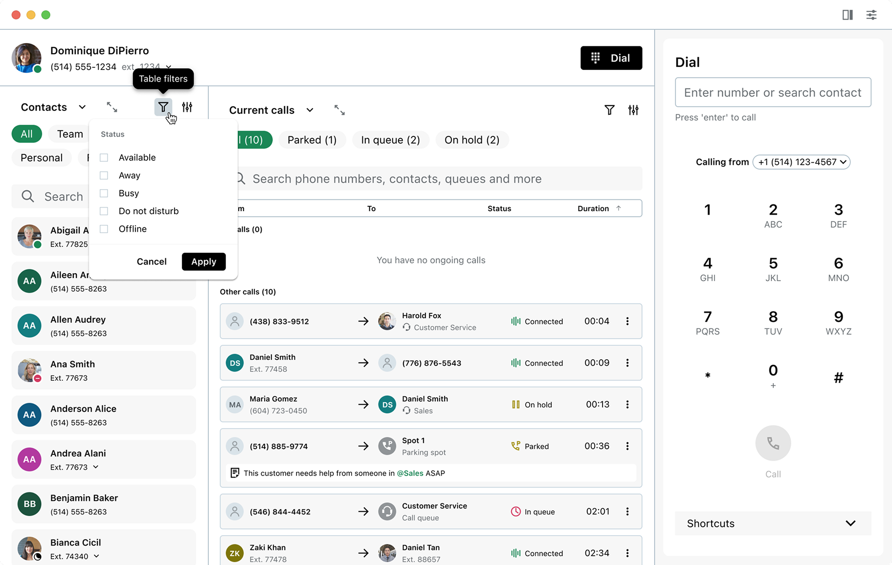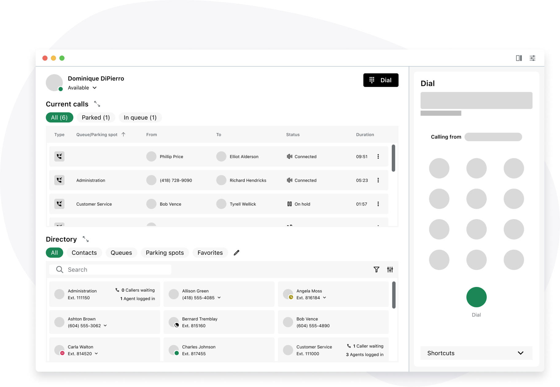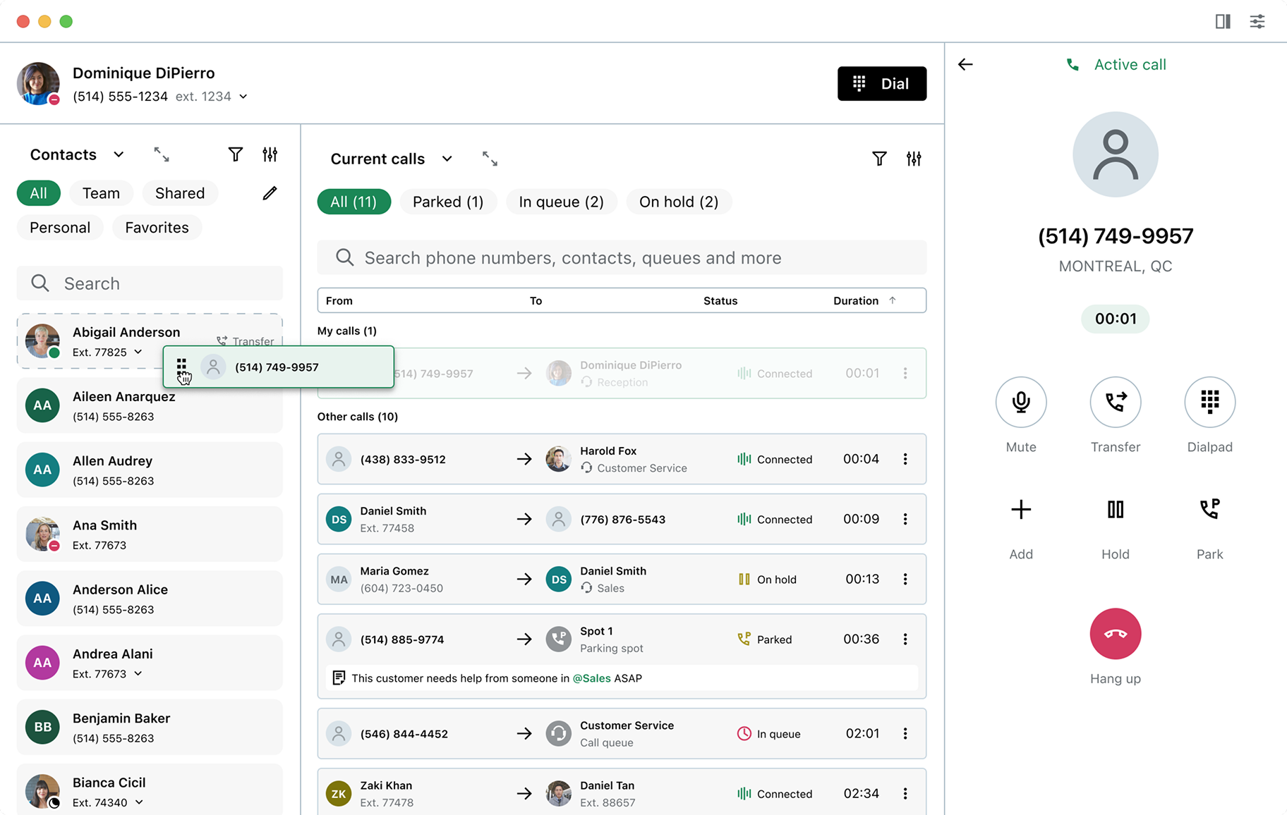 Parking a call allows users to place a caller on hold to be retrieved later or picked up by a colleague. Like call transfers, this can be done from the softphone panel or via drag and drop. Users can search or filter the directory to find an available parking spot, then drag a call onto it to complete the action.
